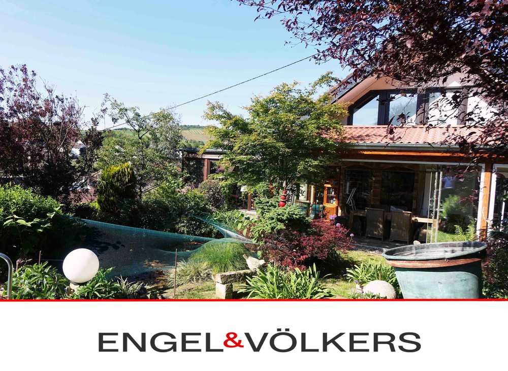 Im EG befinden sich eine moderne Einbauküche mit separatem Essplatz und dem an die Küche anschließenden Wintergarten. Weiterhin ist ein gemütlicher Wohnbereich, der mit dem nach oben geöffneten, großzügigem Anbau und dem Kaminofen eine sehr angenehme und harmonische Atmosphäre ausstrahlt, hier angesiedelt. Von diesem haben Sie Zugang zu einer geräumigen Sonnenterrasse mit Traumblick zur Kirche, über die Gemeinde bis hin zu den Weinbergen. Auch zwei Schlafzimmer (eins mit Zugang zur Terrasse), ein Bad sowie ein Gäste-WC befinden sich noch auf dieser Etage. Vom Wintergarten, wo Sie bereits geschützt Ihre Mahlzeiten einnehmen oder schöne Stunden verbringen können, wenn es draußen noch kalt ist, haben Sie einen wunderbaren Blick und Zugang zum angrenzenden Garten mit allen Annehmlichkeiten. Ein anschließender Terrassengarten, wo es wiederum viel zu entdecken gibt, kann für ganz kleines Geld auf Dauer gepachtet werden.