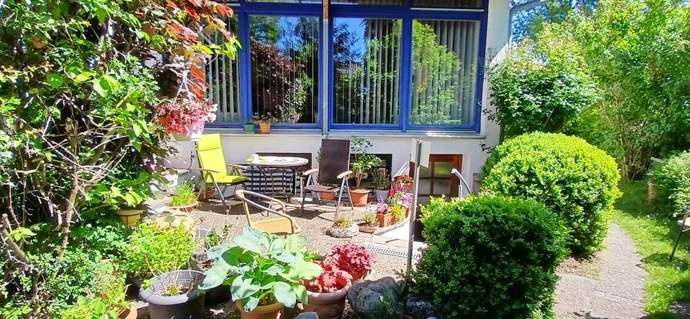 Das Eckgrundstück mit 795m² Fläche liegt an der westlichen Seite von Pöcking. Im Garten befindet sich ein Holzblockhaus.