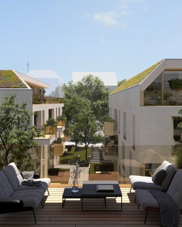 Die drei Gebäude formen einen exklusiven Rahmen und schaffen ein privates Hof- im Hof - Ensemble, als Oase zum Leben. Ob Auto oder Fahrrad, mit Lademöglichkeit oder klassisch, die ebenerdige Parkierungseben im Sockelgeschoss erleichtert das Leben. Aufzüge in allen Häusern und Geschossen sind selbstverständlich. Helle, lichtdurchflutete Grundrisse mit Balkon, Terrasse, Garten oder Dachterrasse runden das neue Lebensgefühl ab.