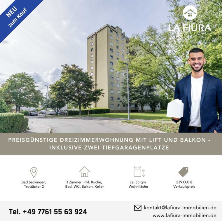 Zum Verkauf steht eine gepflegte Eigentumswohnung mit zwei begehrten Tiefgaragenplätzen in Bad Säckingen. Diese sind bereits im Kaufpreis enthalten und stellen somit einen echten Mehrwert dar. Die Wohnung steht ab 01.11. leer und eignet sich ab diesem Zeitpunkt für Ihre individuellen Pläne.