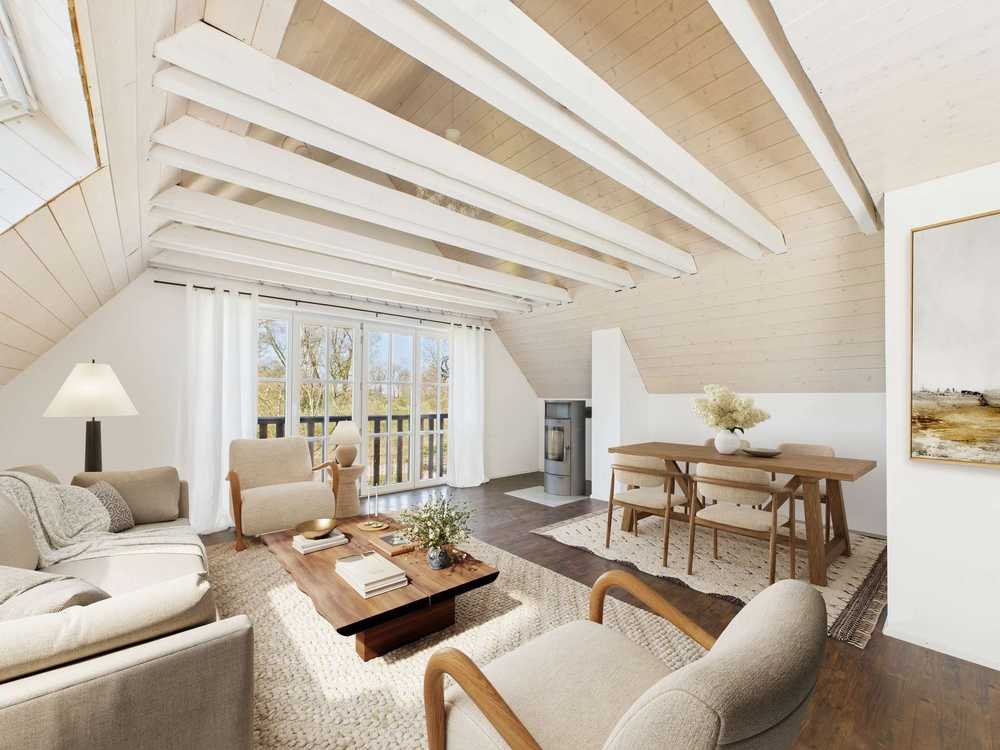 Im Erdgeschoss erwartet Sie ein offener Wohn- und Essbereich mit hochwertiger Einbauküche und stilvollem Kachelofen (Buderus-Einsatz), ein elegantes Bad mit Dusche, ein separates Gäste-WC, ein Schlafzimmer sowie ein weiteres Wohnzimmer. Von der großzügigen Terrasse aus genießen Sie den direkten Zugang in den idyllischen Garten.