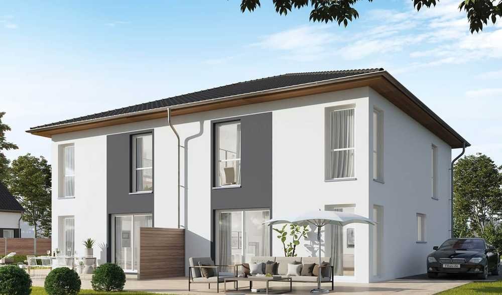 Ihr neues Zuhause. Eine individuell geplante Doppelhausstadtvilla für dieses Grundstück ohne Dachschrägen, auf 130 qm Wohnnutzfläche, mit 4 Zimmern und einem Grundstücksanteil von 369 qm pro Haushälfte.