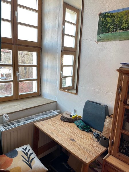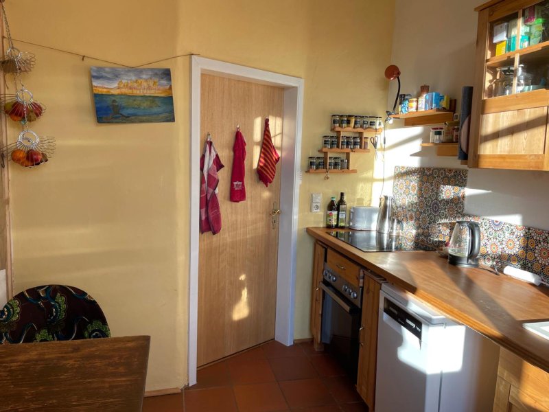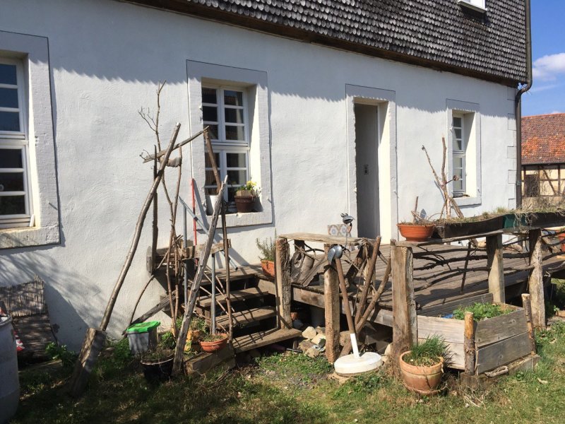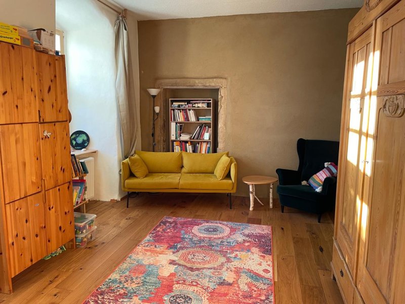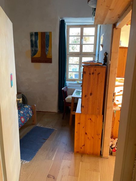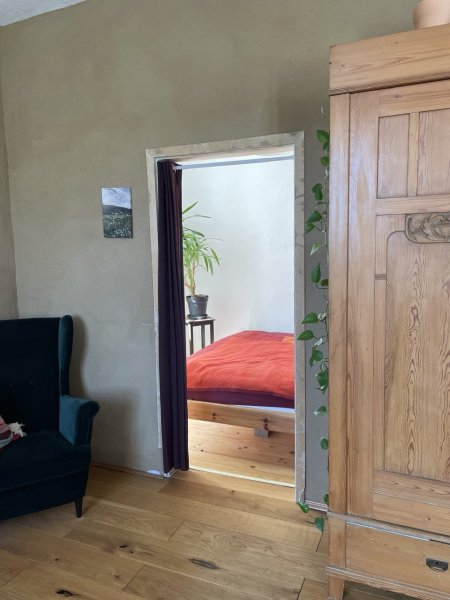 Unsere Wohnung im historischen Fachwerkhaus aus dem 16. Jahrhundert wurde 2022/23 mit viel Liebe und ökologischen Materialien saniert: Lehmputz in allen Zimmern, Dämmung der Außenwände, neue Heizkörper im Zuge der Umstellung auf eine nachhaltige Heizungsanlage. Die originalen Eichenbalken und freigelegtes Fachwerk sorgen für Charakter, neue Holzböden für ein warmes Wohngefühl. Morgens begrüßt dich die Sonne durch die nach Osten ausgerichteten Fenster. Die Ostterrasse hat einen direkten Zugang zum Garten. Die wunderschöne parkartige Gartenfläche von 2500m2 erstreckt sich vor allem über den hinteren Teil des Grundstücks. Es finden sich neben einem Gemüsegarten verschiedene alte Bäume, Wiesenflächen und historische Steinfundamente.