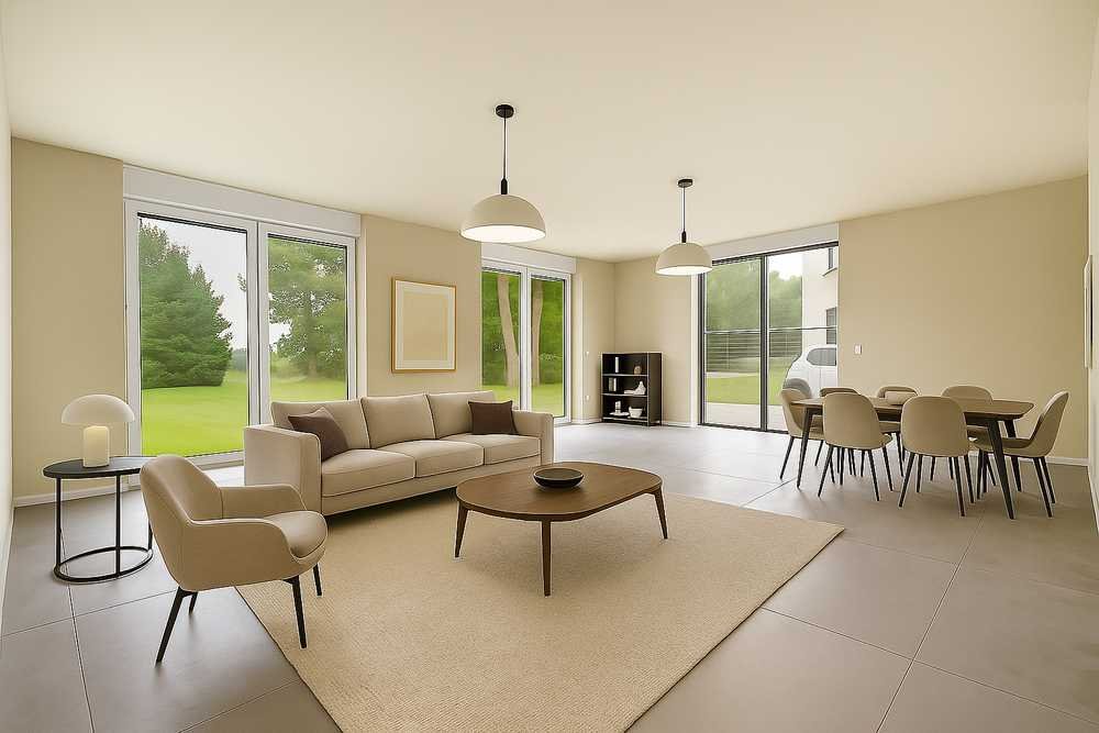 - Moderne Architektur mit bodentiefen Fenstern, großformatigen Fliesen und hochwertigen Bodenbelägen