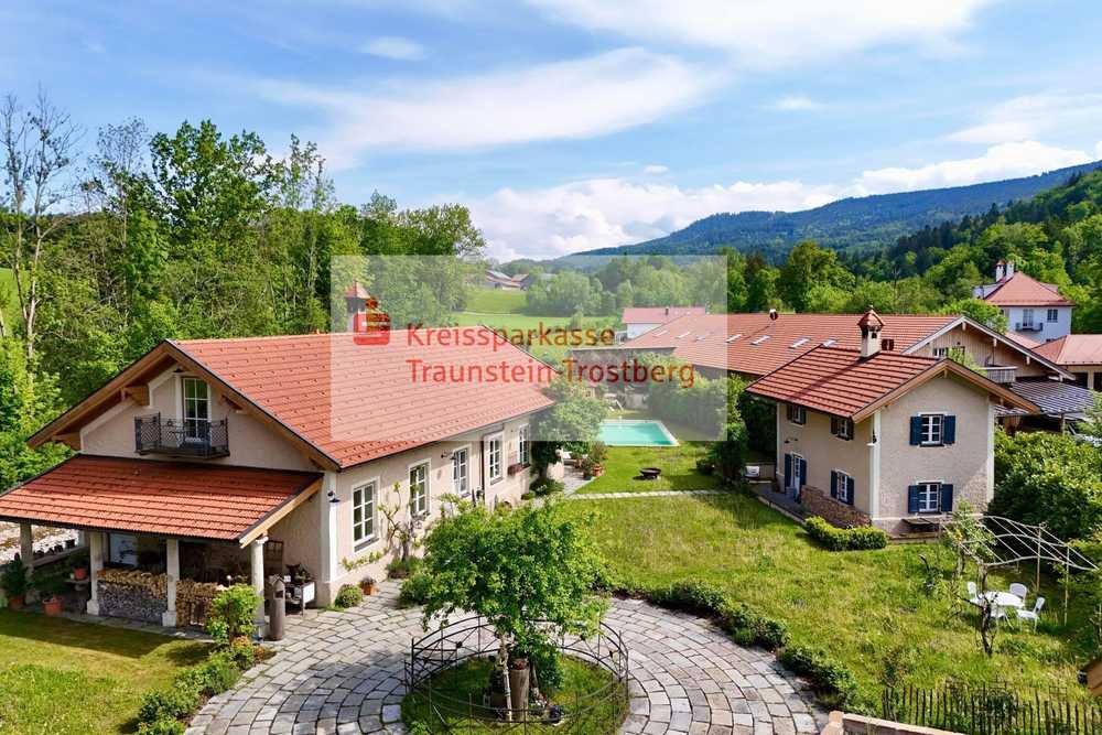 Dieses einzigartige Anwesen auf einem ehemaligen Gutsgelände vereint historischen Charme mit modernem Wohnkomfort auf einem großzügigen Grundstück von ca. 2.286 m². In malerischer, ruhiger Lage direkt neben der Roten Traun gelegen, bietet es eine seltene Kombination aus Naturidylle, Privatsphäre und hochwertiger Ausstattung.