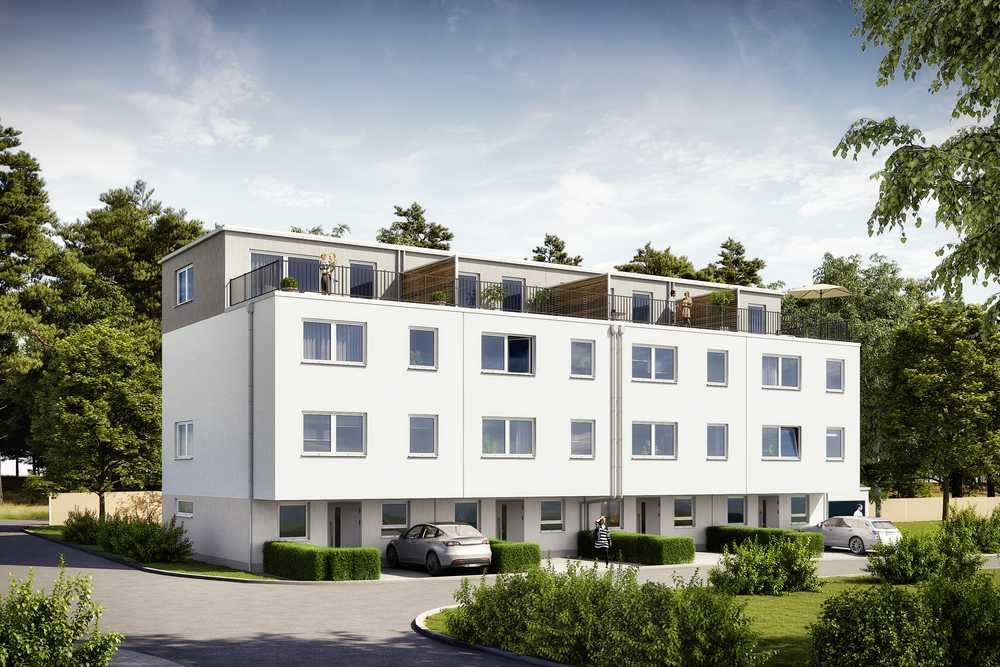 Auf dem Eigentumsgrundstück entsteht eine Reihenhauszeile mit vier baugleichen Häusern. Im Erdgeschoss liegt ein Gäste-WC, der Hausanschlussraum und der großzügige Wohn- und Essbereich. Dieser öffnet sich zur Terrasse und dem Gartenanteil. Im 1. Obergeschoss befindet sich der Elternbereich mit Schlafzimmer, Bad en Suite und Ankleide. Im 2. Obergeschoss stehen mehrere Schlafzimmer, ein weiteres großes Bad und ein Hauswirtschaftsraum zur Verfügung. Das Staffelgeschoss bietet ein vielseitig nutzbares Studio mit Zugang zur südlich ausgerichteten Dachterrasse. Die Raumaufteilung bietet ausreichend Platz für größere Haushalte oder Wohngemeinschaften mit Anspruch. Vor dem Haus stehen zwei Stellplätze zur Verfügung.