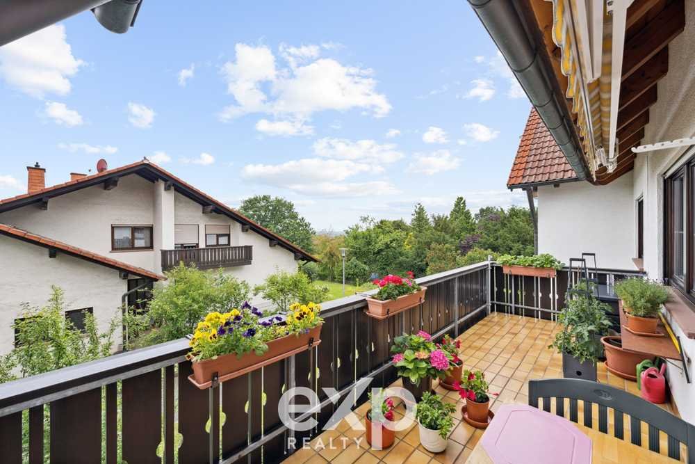 Das helle Wohn- und Esszimmer ist mit edlem Echtholz-Parkett aus Ahorn ausgelegt und bietet durch das große Fenster sowie die Tür zum sonnigen Süd-Balkon ein besonders freundliches Wohnambiente. Die elektrische Markise sorgt an heißen Tagen für angenehmen Schatten, während man den Fernblick ungestört genießen kann.