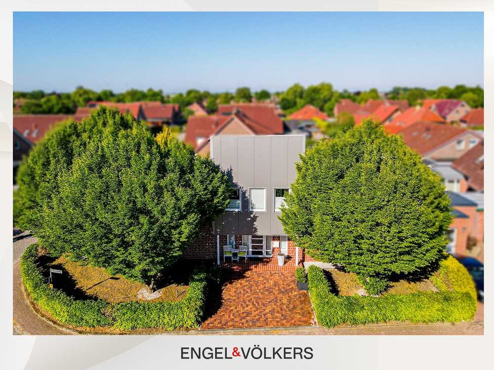 Dieses außergewöhnliche Einfamilienhaus überzeugt durch seine besondere Architektur und ein Wohnkonzept, das auf Offenheit, Licht und Großzügigkeit setzt. Wer das Gefühl von Freiheit und Weite liebt, wird sich hier sofort zu Hause fühlen. Über einen überdachten, von zwei Sträuchern flankierten Eingangsbereich betreten Sie die rund 165 m² Wohnfläche dieses besonderen Hauses. Bereits beim Eintreten eröffnet sich Ihnen ein beeindruckender, offener Wohnbereich mit gemütlichem Kamin und einer Vielzahl großformatiger Fensterelemente, die für eine helle und freundliche Atmosphäre sorgen. Die fließende Verbindung von Wohnbereich, Küche und Obergeschoss schafft ein luftiges Raumgefühl und unterstreicht das moderne, offene Wohnkonzept. Ein besonderes Highlight ist die großzügige Galerie im Obergeschoss. Sie bietet vielfältige Nutzungsmöglichkeiten – ob als Bibliothek, Spiel- oder Billiardzimmer, stilvolles Homeoffice oder ruhiger Rückzugsort. Zusätzlich befinden sich hier ein Duschbad sowie ein praktischer Abstellraum. Im Erdgeschoss führt ein Flur von der Küche aus direkt in den Gartenbereich. Hier sind ein separater Vorratsraum sowie der Haustechnikraum untergebracht. Auf der anderen Seite des Hauses gelangen Sie in zwei großzügig geschnittene Schlafzimmer sowie in das stilvolle Hauptbad. Hohe Decken und große Fenster sorgen in allen Räumen für ein helles, offenes Wohngefühl. Auch der Außenbereich lässt keine Wünsche offen: Eine rund 60 m² große Terrasse, unterteilt in verschiedene Zonen, bietet Sonnen- wie Schattenplätze – dank eines modernen Sonnensegels und natürlicher Beschattung durch Bäume. Ob gemütlicher Lounge-Bereich, Essplatz oder Leseecke im Grünen – hier findet jeder seinen Lieblingsplatz. Ein Carport bietet Schutz für Ihr Fahrzeug oder sogar ein Wohnmobil. Die Lage überzeugt durch kurze Wege: Sie erreichen Leer schnell mit dem Auto, genießen die fußläufige Nähe zum Emsdeich und haben eine ideale Anbindung an die Autobahn. Dieses Haus vereint anspruchsvolle Architektur mit durchdachter Raumaufteilung und naturnaher Lage – ideal für alle, die großzügiges, lichtdurchflutetes Wohnen mit bester Infrastruktur verbinden möchten.