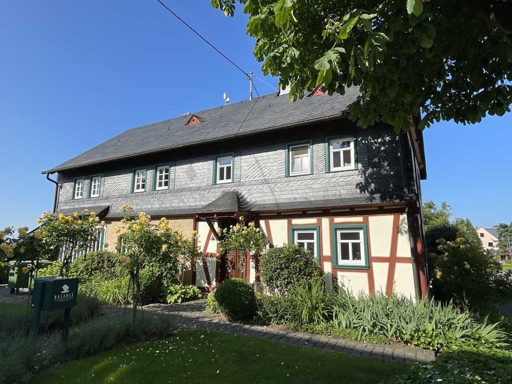 Das Naturschieferdach mit heimischem Schiefer ist handwerklich fein verarbeitet. So auch die Giebelgestaltung. Die Gefache des Fachwerks sind ausgemauert und in historischem Stil gestrichen. Die Materialien sind auf die Funktionalität hin aufeinander abgestimmt.