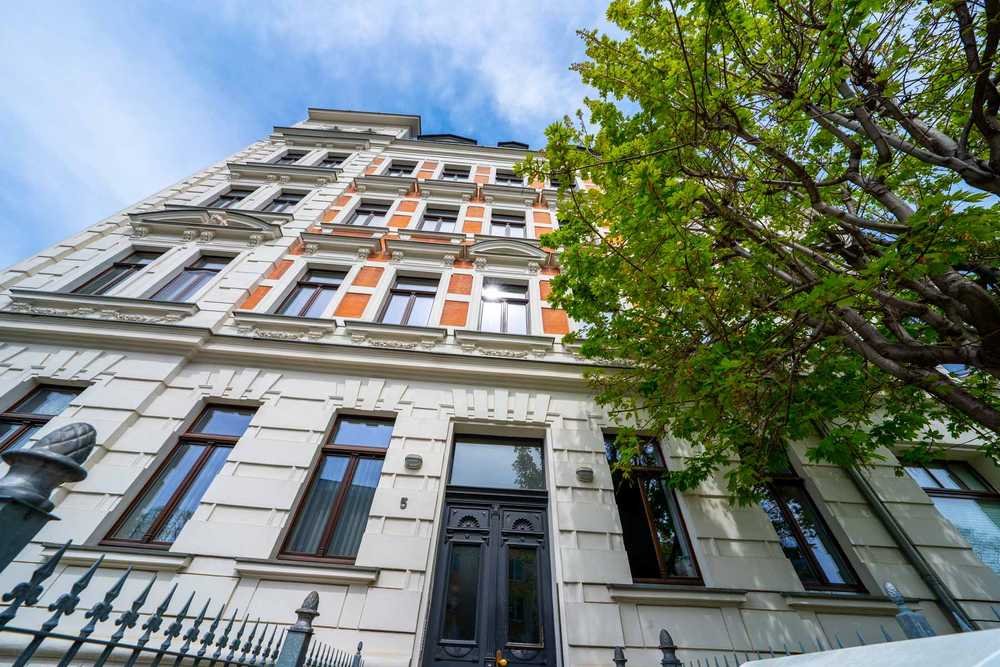 The the majority of the flats from the ground floor to the third floor have balconies or bay windows facing the green and quiet inner courtyard, the converted attic floor has no terraces. The classic old building elements such as stucco façade, wooden coffered interior doors and partly parquet and stucco in the individual flats are present and have been professionally refurbished and the windows have been replaced and are made of wood with double glazing.