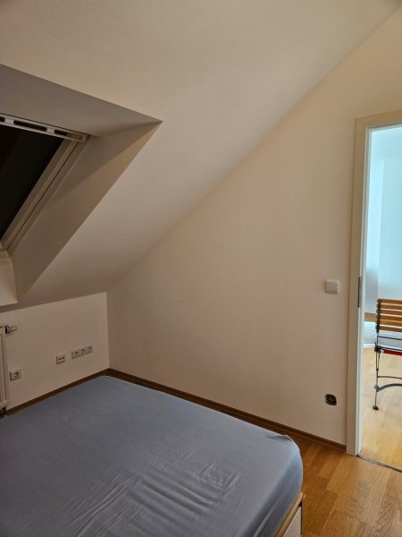 Das Schlafzimmer und die Küche haben eine Dachschräge. Die darin befindlichen Fenster und Rollos sind elektrisch bedienbar.