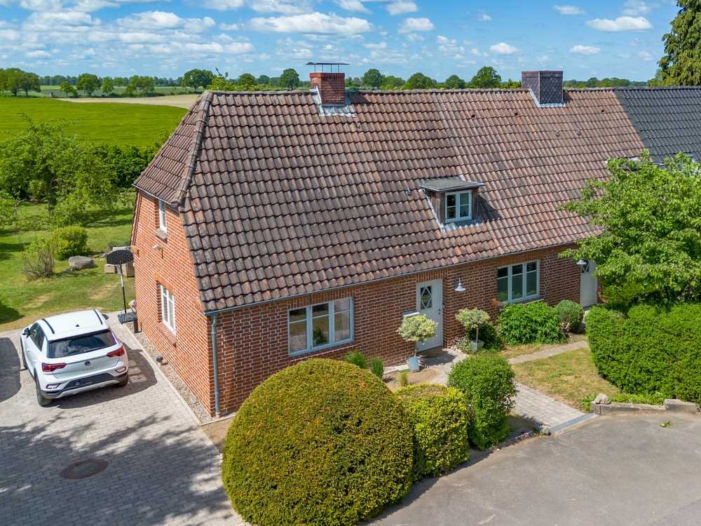Willkommen in einem Zuhause, das Vergangenheit und Gegenwart auf besondere Weise vereint. Diese im Jahr 1949 massiv erbaute Doppelhaushälfte war einst Dorfkneipe und Krämerladen – heute ist sie ein liebevoll modernisiertes Refugium, das mit zeitgemäßer Technik überrascht und zugleich den ursprünglichen Charme bewahrt. Schon der erste Eindruck lässt aufhorchen: warmes Rotklinker-Mauerwerk, ein liebevoll angelegter Garten mit altem Obstbaumbestand, blühenden Sträuchern und freien Blicken über Felder und Wiesen. Zwei Terrassen, eine davon überdacht, schaffen geschützte Orte zum Innehalten und Genießen. Ergänzt wird das Ensemble durch ein ausbaufähiges Nebengebäude für kreative Nutzungsideen sowie zwei befestigte Stellplätze, die über eine eigene Lademöglichkeit für E-Fahrzeuge verfügen. Das Innere des Hauses beeindruckt mit fünf geschmackvoll eingerichteten Zimmern auf rund 155 m² Wohnfläche. Im Erdgeschoss öffnet sich der in hellen Farbtönen gestaltete Wohn- und Essbereich, der durch große Fensterflächen viel Licht aufnimmt. Ein Kaminofen spendet in der kalten Jahreszeit wohlige Wärme und unterstreicht das gemütliche Ambiente. Direkt anschließend befindet sich die offene, farblich abgestimmte Einbauküche, die sowohl funktional als auch gestalterisch überzeugt. Eine Fußbodenheizung sorgt hier für zusätzlichen Komfort. Ebenfalls auf dieser Ebene befinden sich ein Schlafzimmer, ein Arbeitszimmer sowie ein stilvoll modernisiertes Badezimmer mit Wanne und Dusche. In den Wohnräumen, mit Ausnahme von Küche und Bad, wurde hochwertiger Holzdielenboden verlegt. Im Obergeschoss setzt sich das behagliche Wohnkonzept fort. Zwei charmante Zimmer mit offenem Giebel, sichtbaren Holzbalken und herrlichem Ausblick in die Natur bieten vielseitige Nutzungsmöglichkeiten – ob als Kinder-, Gäste- oder Rückzugszimmer. Das großzügige Tageslichtbad mit freistehender Wanne überzeugt mit seiner Helligkeit und hochwertigen Ausstattung. Mit seiner hohen Energieeffizienz und der modernen Wärmepumpe präsentiert sich das Haus als zukunftsorientierte Immobilie – umweltfreundlich im Betrieb und überzeugend bei den laufenden Energiekosten. Der vorhandene Glasfaseranschluss sichert eine stabile und schnelle Internetverbindung – ideal für Homeoffice und multimediale Anwendungen. Im Jahr 2009 wurden Fenster, Dach, Elektrik und Wasserleitungen umfassend erneuert. Die letzten Sanierungs- und Modernisierungsarbeiten erfolgten im Jahr 2021. Dieses Haus ist ein Ort für Menschen, die das Ursprüngliche schätzen und gleichzeitig auf moderne Wohnqualität nicht verzichten möchten.