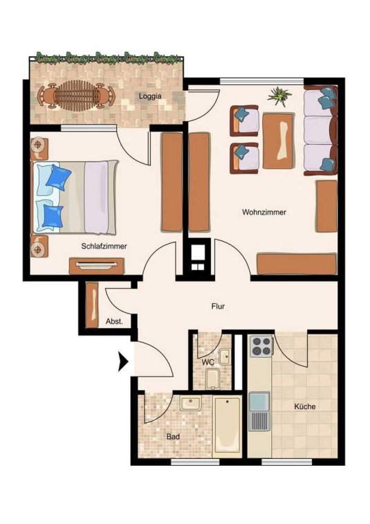 Die Raumaufteilung umfasst ein gemütliches Wohn- und Esszimmer. Angrenzend an diesem befindet sich ein Zugang zum Balkon, auf dem Sie die Sonne genießen können. Das Schlafzimmer, das einen ruhigen Rückzugsort darstellt, hat ebenfalls einen Zugang zum Balkon. Weiterhin gehört zur Wohnung eine funktionalgeschnittene Küche, ein separates WC sowie ein Badezimmer.