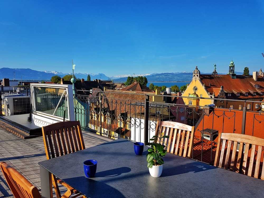 Dank eines Handlaufes ermöglicht die elektrisch steuerbare Dachluke einen angenehmen Aufstieg nach oben zur beeindruckenden Dachterrasse mit atemberaubendem 360° - Rundumblick über die Lindauer Insel, den Bodensee und die Berge. Diese steht selbstverständlich ausschließlich dieser Wohnung zur Verfügung. Nahezu am höchsten Punkt gelegen, blicken Sie frei über die umgebenden Gebäude hinweg bis zum kleinen See sowie zur Alpenkette und zum Pfänder. Die Terrasse ist großzügig gestaltet und bietet genügend Fläche für einen großen Esstisch und eine Sitzlounge. Somit stellt die Dachterrasse sicher ein weiteres Highlight und ein seltenes Angebot auf der Lindauer Insel dar.