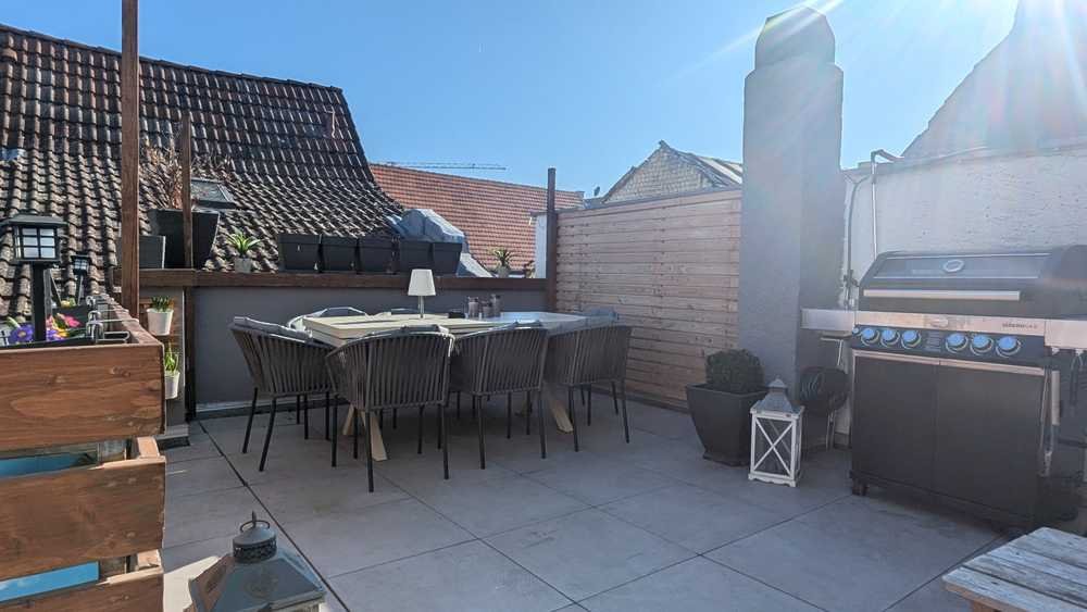 Das moderne Bad mit bodentiefer Dusche, weißen Fliesen und Holzelementen kombiniert zeitgemäßes Design mit Funktionalität. Ein kleines Fenster bringt Tageslicht herein, während der praktische Waschtisch Stauraum bietet. Die Terrasse wird durch eine Holzverkleidung vor Blicken geschützt und mit einer Outdoor-Küche inklusive Grill zur Wohlfühloase für gesellige Abende.