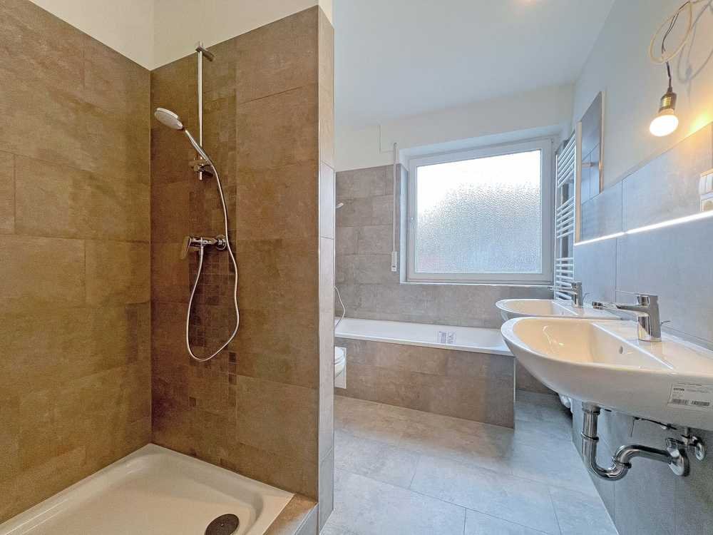 Beim Betreten der Wohnung finden Sie auf der linken Seite das Tageslichtbad mit Badewanne und separate Dusche. Der Flur führt Sie weiter in das offene und großzügige Wohn- und Esszimmer, das gemeinsam mit der offenen Küche den Mittelpunkt des Wohnraums bildet. Hier haben Sie die Freiheit, den Bodenbelag nach Ihren eigenen Vorstellungen zu gestalten, um den Raum individuell zu gestalten. Die offene Gestaltung schafft eine einladende Atmosphäre und ist perfekt für gesellige Abende oder Familienmahlzeiten.