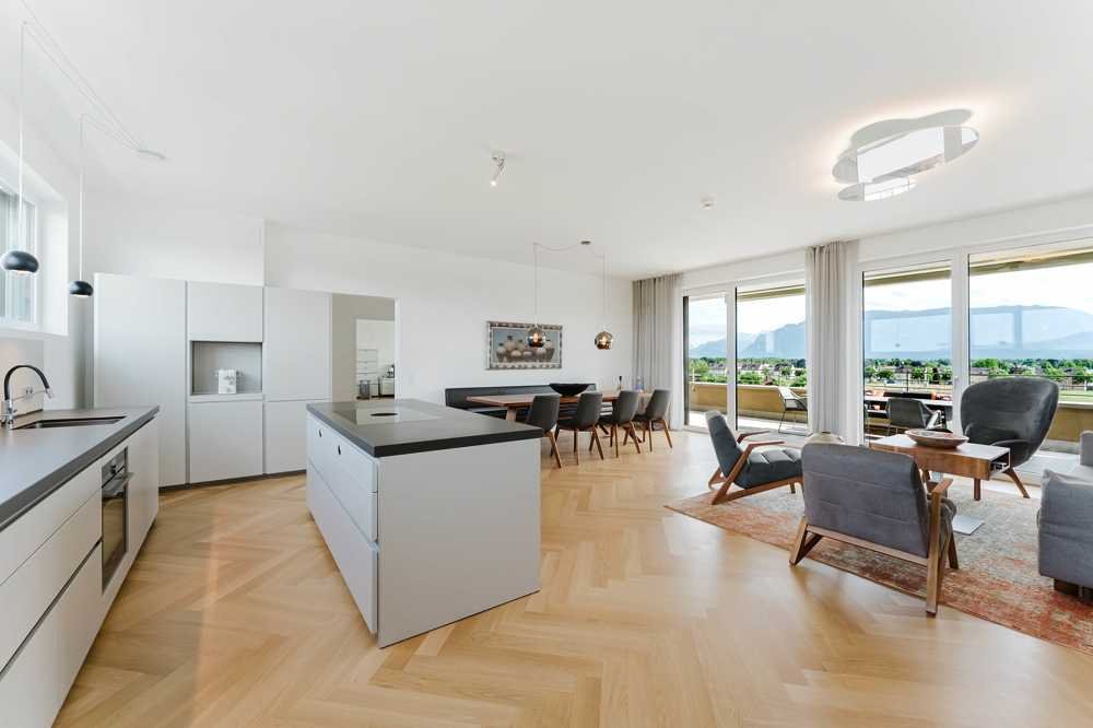 Bei der Gestaltung wurde Wert auf Design und Lichteinfall gelegt. So ist eines der Highlights ein Lichtband als Fenster, welches sich durch die gesamte Wohnung zieht und die Räumlichkeiten in natürliches Licht taucht. So entsteht zu jeder Tageszeit eine warme, einladende Atmosphäre, die den modernen Wohnkomfort unterstreicht.