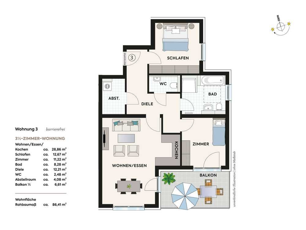 Die Wohnung ist praktisch aufgeteilt und bietet ein lichtdurchflutetes Wohn-/Esszimmer mit offener Küche. Der sonnige Südbalkon lädt zu entspannten Grillabenden oder einem gemütlichen Kaffee am Morgen ein – der perfekte Ort, um die Sonne zu genießen.