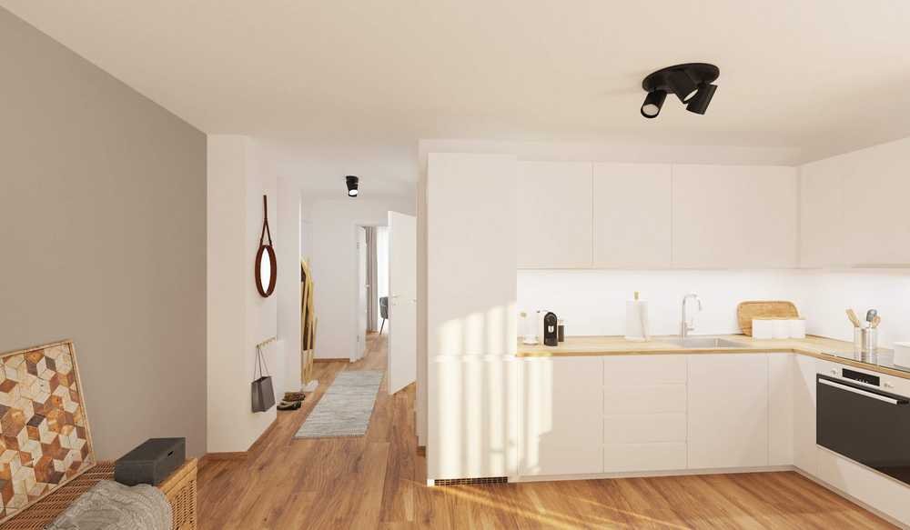 Es empfängt Sie ein gemütlicher Flur, der Sie direkt in das geräumige Wohnzimmer mit offener Küche führt. Hier können Sie Ihre Kochkünste entfalten und gesellige Abende verbringen. Der angrenzende Balkon lädt zum Entspannen ein und bietet Ihnen eine kleine Oase im Freien. Das Schlafzimmer bietet ausreichend Platz für Ihre Einrichtungsideen. Das moderne Badezimmer begeistert mit Tageslicht, einer bodengleichen Dusche und genug Platz für Waschmaschine und Trockner. Ein kleiner Abstellraum und ein eigener Keller bieten zusätzlichen Stauraum für Ihre Habseligkeiten.