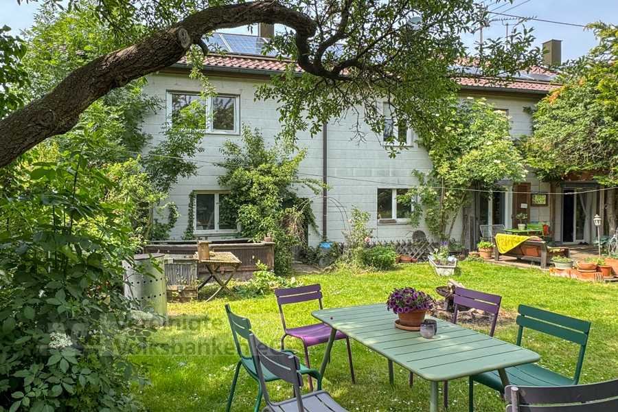 Der weitläufige Garten, von beiden Haushälften zugänglich, bietet viel Platz für Erholung, Hobby oder Familienleben. Zwar erfordert er etwas Pflege, doch genau hierin liegt die Möglichkeit, sich eine individuelle grüne Oase zu schaffen – mit altem Baumbestand, Platz für Hochbeete, Spielbereiche oder eine großzügige Terrasse. Der Garten wird zur natürlichen Erweiterung des Wohnraums in den wärmeren Monaten.
