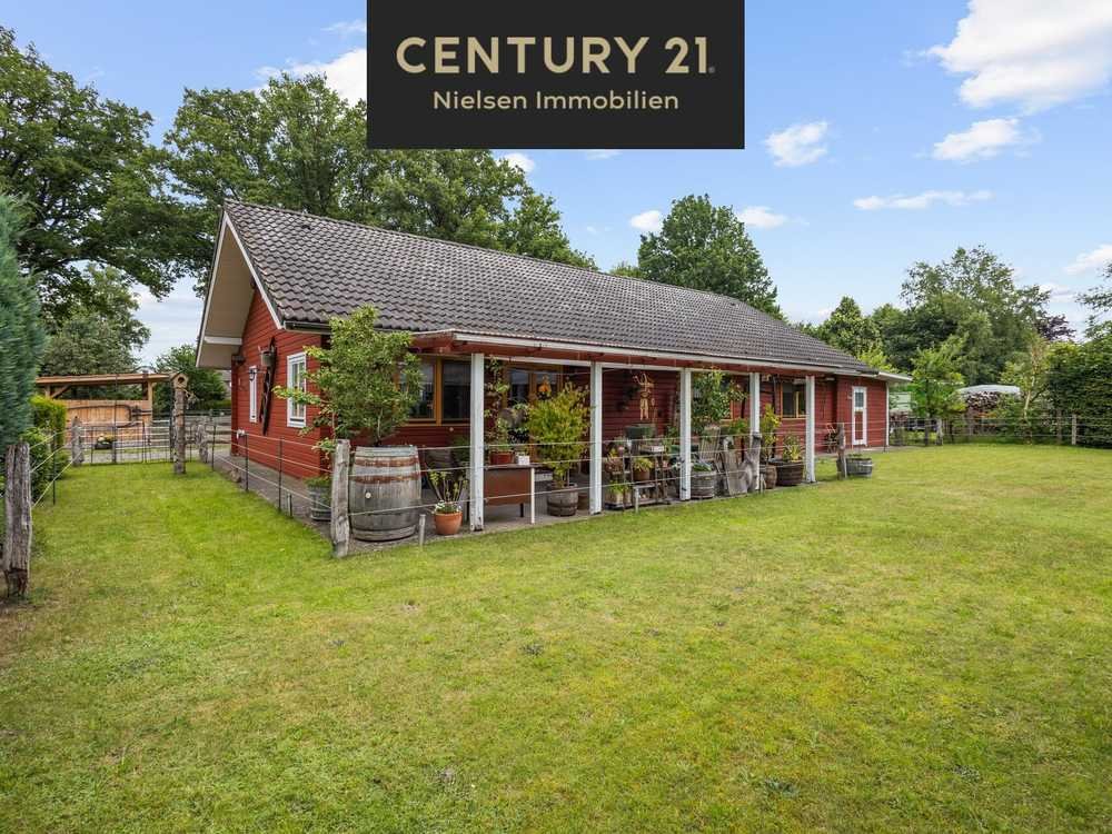 Hier präsentiere ich Ihnen eine außergewöhnlich schöne Kombination aus der Kategorie „Wohnen mit Tieren am Haus“. Das Schwedenhaus (Niedrig-Energieblockhaus) vermittelt sofort eine Grundwärme und lädt zum Verweilen ein. Es steht auf einem sonnigen 700m² großen Grundstück und verfügt über ca.153m² Wohn-Nutzfläche, die sich auf einer Ebene (inkl. Anbau) verteilen. Des Weiteren verfügt das Haus über ein Doppelcarport und einer nach Süden ausgerichteten überdachten Terrasse.