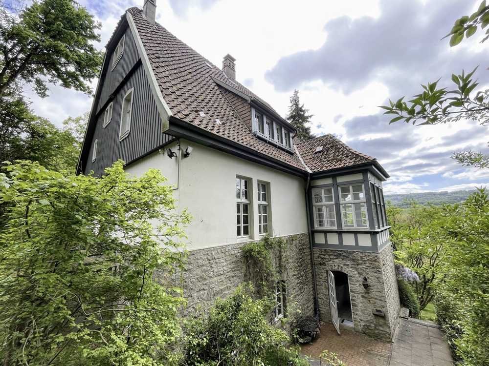 Die denkmalgeschützte Villa selbst ist ein architektonisches Juwel aus der Zeit des Jugendstils. Ihre elegante Erscheinung wird geprägt von einem formvollendeten Krüppelwalmdach, stilvollen Erkern, großzügigen Fensterflächen und einer beeindruckenden Deckenhöhe von ca. 3,30 m. Die zahlreichen Fenster ermöglichen aus nahezu jedem Raum einen weiten, unverbauten Blick ins Tal und auf die umliegende Natur – ein echtes Highlight, das den Wohnräumen eine besondere Großzügigkeit und Leichtigkeit verleiht.