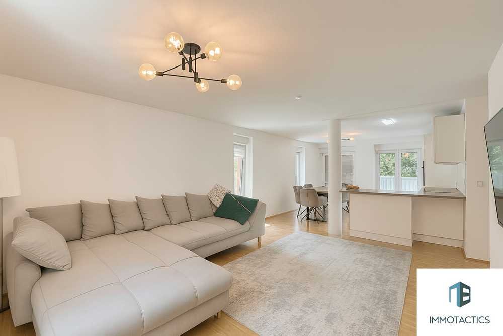 Die Aufteilung der Wohnung ist ein echtes Plus: Drei abgeschlossene Schlafzimmer eröffnen vielfältige Nutzungsmöglichkeiten – für Familien, Berufstätige mit Homeoffice oder als Kombination aus Wohnen und Arbeiten. Der Wohn- und Essbereich ist großzügig geschnitten, lichtdurchflutet und bildet das zentrale Element der Wohnung. Eine moderne, offen gestaltete Küche schafft einen fließenden Übergang zum Wohnbereich – ein Ort, der sowohl Funktionalität als auch Atmosphäre bietet.
