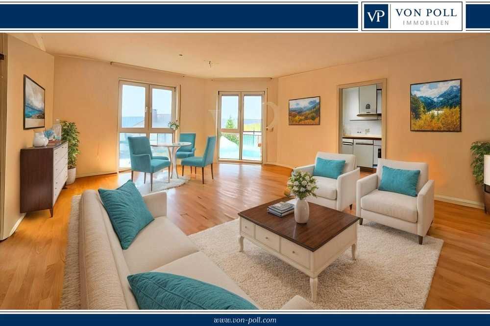 Das geräumige Wohn-Esszimmer lädt zum Wohlfühlen ein und bietet direkten Zugang zu einem sonnigen Balkon mit beeindruckendem Panoramablick – perfekt für entspannte Stunden im Freien.