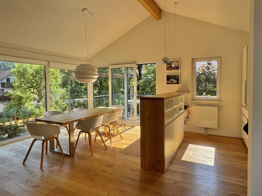 Die lichtdurchflutete obere Etage ist das Herzstück des Hauses. Hier vereinen sich Wohnbereich, Essplatz und Küche zu einem offenen Lebensraum, der durch große Fenster den Blick auf den Kofel (Hausberg von Oberammergau) und ein Bergpanorama freigibt. Natürliche Materialien, klare Linien und viel Tageslicht schaffen eine warme, moderne Wohnatmosphäre.