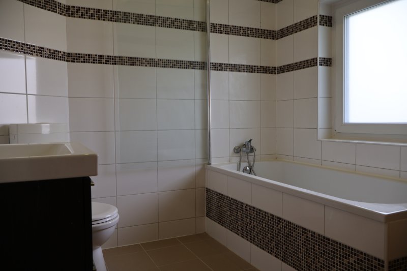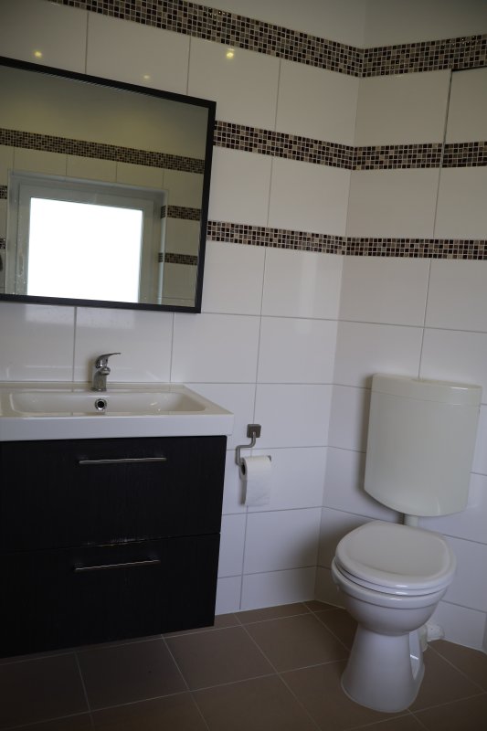 Hochwertiger Laminatboden in Wohnräumen, Fliesen in Küche und Bad