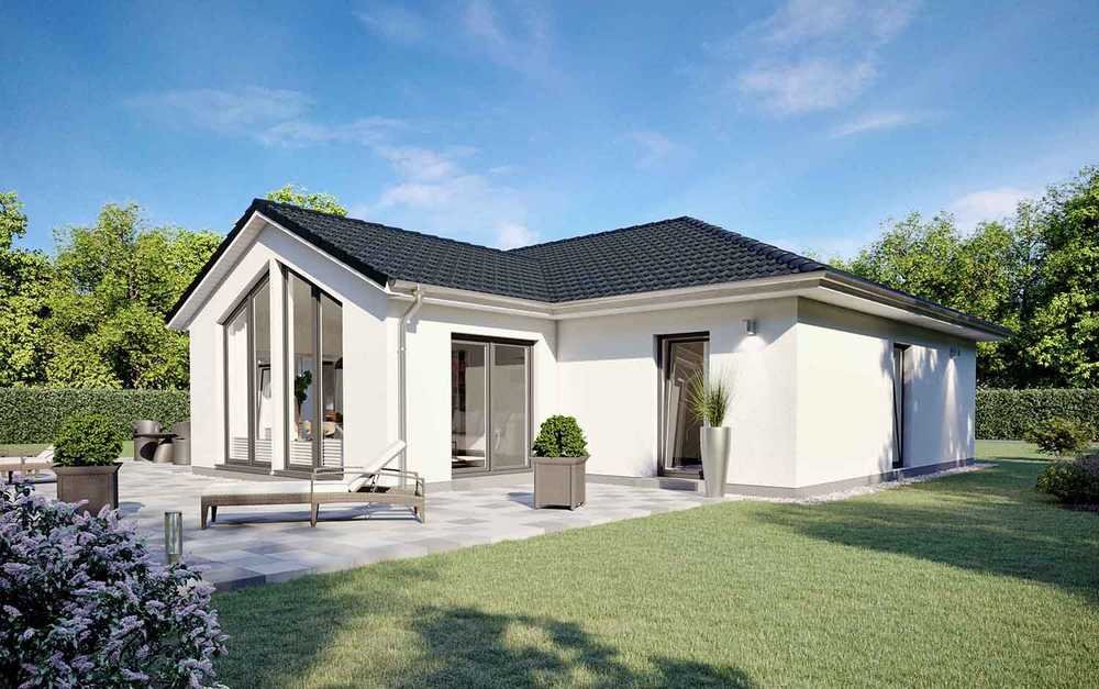 Dieser Winkelbungalow ist einfach ein Hingucker: Durch eine Kombination aus Kathedraldecke und Panoramaverglasung im Wohn-/Essbereich entsteht ein beeindruckendes Raumgefühl mit faszinierendem Ausblick. Getoppt wird das Ganze noch durch die optionale Überdachung des Freisitzes – mondän!