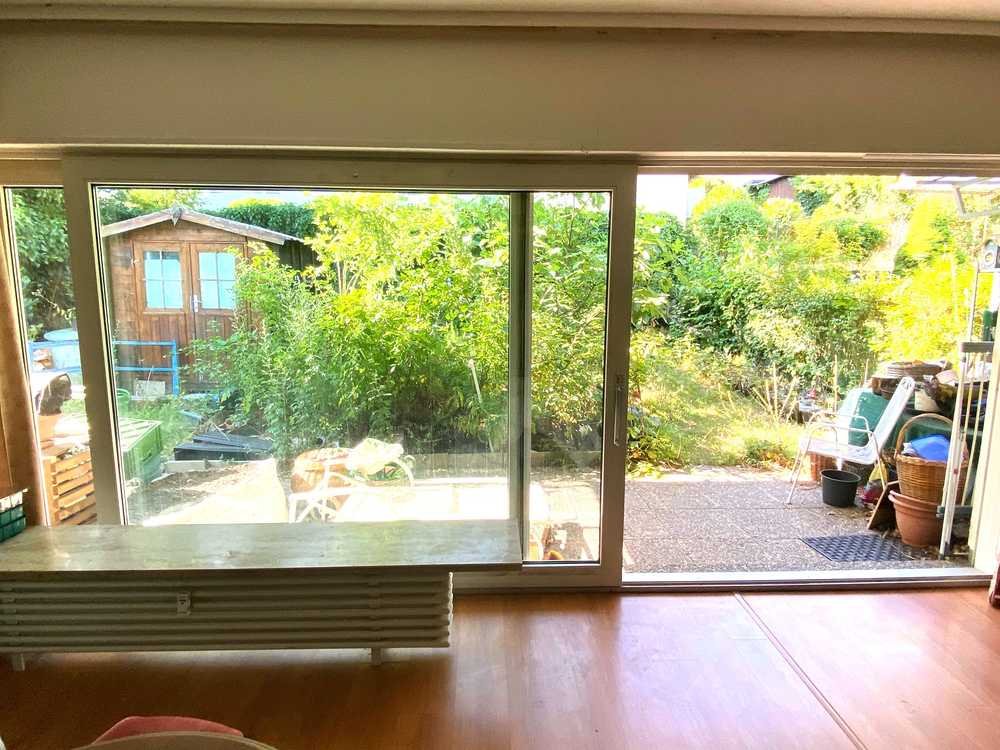 Beim Betreten der Wohnung fällt einem der helle und offene Wohnbereich ins Auge. Die breite Panorama-Fensterfront eröffnet einen herrlichen Blick auf die überdachte Terrasse und den eigenen Garten, der mit einem Feigenbaum und einem Gartenhäuschen ausgestattet ist – perfekt für entspannte Stunden im Freien.