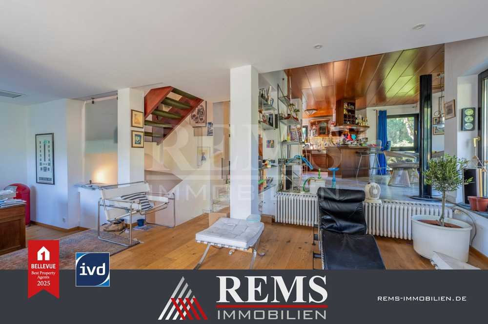 Diese Doppelhaushälfte des Architektenhauses aus dem Baujahr 1980 befindet sich auf einem großzügigen Grundstück von ca. 649 m² und bietet eine Gesamtwohnfläche von ca. 189,5 m². Das besondere Baukonzept mit versetzten Ebenen sorgt für eine besondere Raumaufteilung und ein einzigartiges Wohnerlebnis. Die zugehörige Einliegerwohnung bietet zusätzliche Flexibilität und Nutzungsmöglichkeiten.