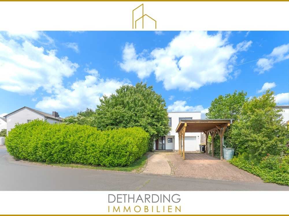 Der Außenbereich des Objektes ist ansprechend angelegt, und das etwa 582 Quadratmeter große Grundstück ist von einer dichten Hecke umgeben. Es gibt sowohl schattige und privatere Bereiche, so zum Beispiel die Terrasse, als auch sonnige und offenere Orte. Neben der Garage befindet sich vor dem Haus eine weitere Parkmöglichkeit in Form eines Carports. Das Haus ist an das Glasfasernetz angeschlossen.