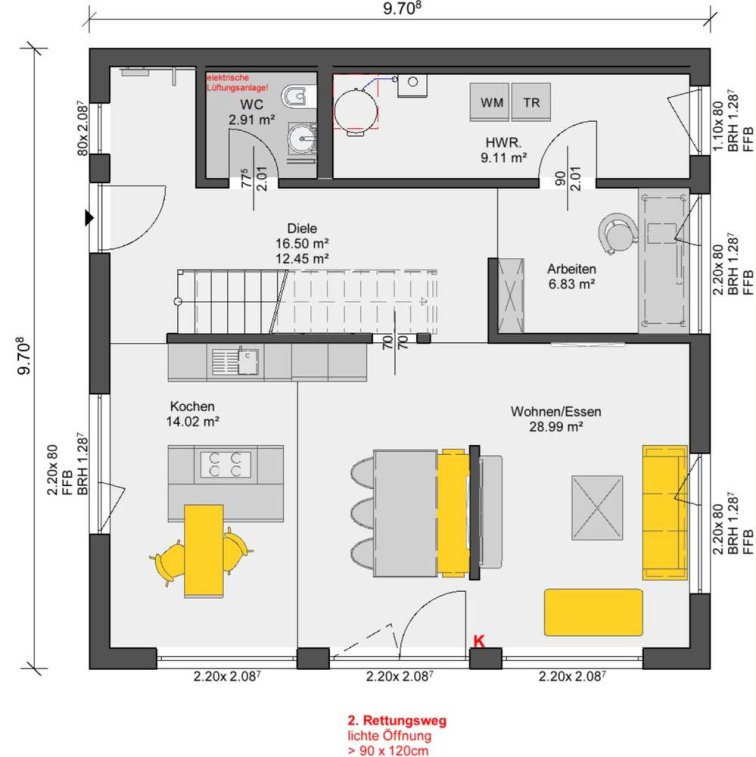 Das Haus wird bezugsfertig ohne Keller auf einer Bodenplatte erstellt. Der angegebene Preis umfasst das Grundstück sowie das schlüsselfertige Haus mit Bodenplatte, jedoch ohne Baunebenkosten und voraussichtliche Außenanlagen.