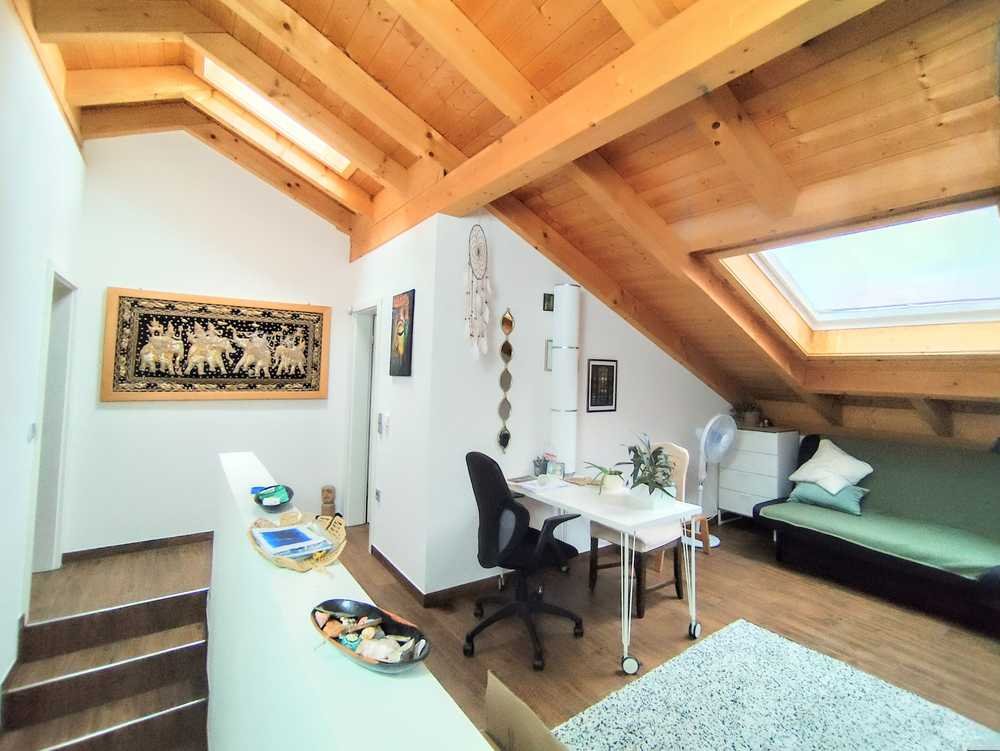Im Obergeschoss befindet sich ein großzügiges Schlafzimmer sowie ein stilvolles Badezimmer mit Badewanne und Dusche. Das Dachgeschoss und die Galerie bieten ein weiteres, vielseitig nutzbares Zimmer – ideal als Büro, Gäste- oder Elternbereich sowie ein kleines Badezimmer mit Dusche.