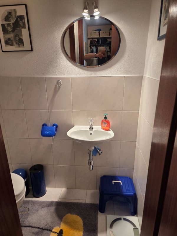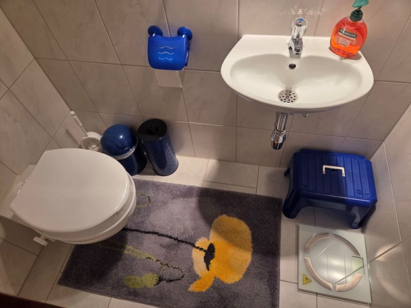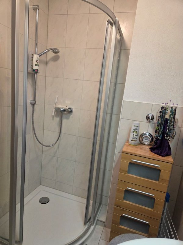 Bad und Toilette neu bis Schulterhöhe gefliest, neue Duschkabine