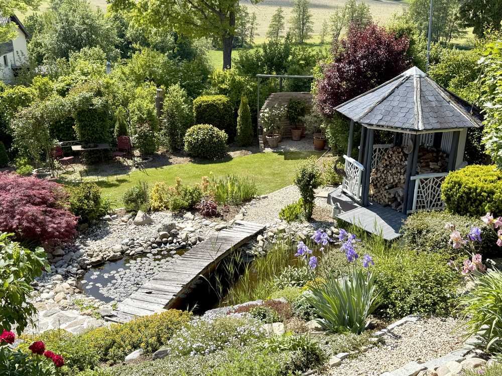 Besonders hervorzuheben ist das traumhaft angelegte Grundstück mit vielen tollen Details. Gartenteich, Gartenhaus und mehrere Sitzbereiche sind nur wenige davon. Für Parkmöglichkeiten steht Ihnen eine Doppelgarage zur Verfügung.