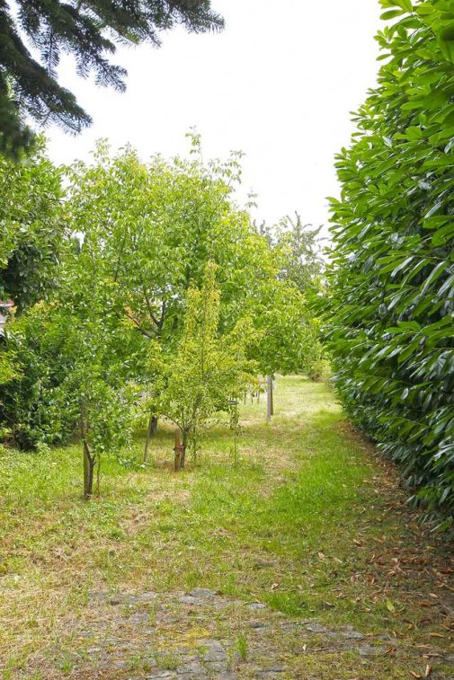 Großer Garten (ca. 1.200 m²) mit zahlreichen Bäumen und einem 4 m großen Stahlwandpool – perfekt für Familien und Naturliebhaber