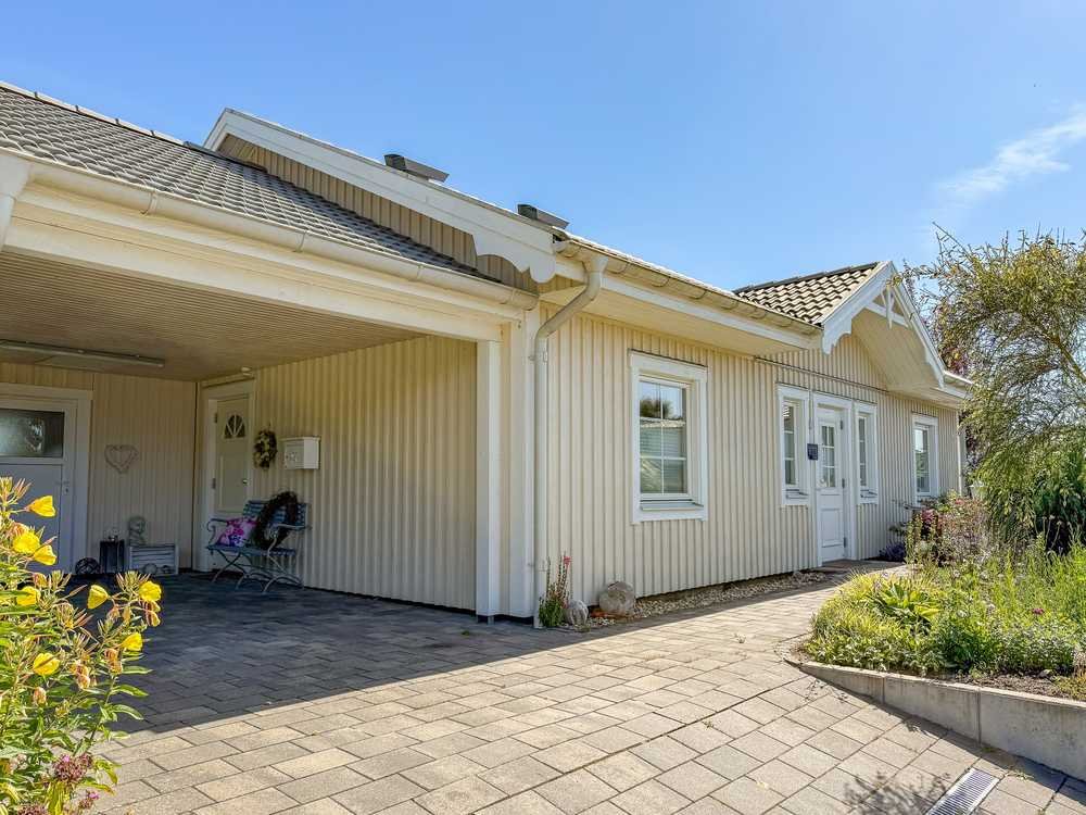 Dieser hochwertige Winkelbungalow im charmanten Schwedenstil wurde 2018 von der renommierten Hausbaufirma Rörvikshus in energieeffizienter Holzständerbauweise errichtet und erfüllt den Standard eines KfW-Effizienzhauses 55, ideal für alle, die Wert auf nachhaltiges, zukunftsorientiertes Wohnen legen. Die ca. 108 m² Wohnfläche verteilen sich auf einer Ebene und bieten ein durchdachtes, barrierearmes Wohnkonzept. Über die großzügige Diele erschließen sich alle Räume des Hauses. Im Mittelpunkt steht der offene Essbereich mit angrenzender Küche, welche mit einer hochwertigen Einbauküche ausgestattet ist und direktem Zugang zum Hauswirtschaftsraum bietet. Der weitläufige Wohnbereich überzeugt durch seine Helligkeit und führt direkt auf die großzügig gestaltete Veranda, ideal für entspannte Stunden im Freien. Ein Gästezimmer, ein Bürozimmer sowie ein modernes Tageslichtbad mit bodengleicher Dusche bieten vielseitige Nutzungsmöglichkeiten. Das geräumige Schlafzimmer sowie ein separates Gäste-WC runden den durchdachten Grundriss ab. Die Ausstattung des Hauses lässt keine Wünsche offen: Echtholzböden, eine effiziente Luft-Wasser-Wärmepumpe mit Fußbodenheizung, hochwertige Innentüren und stilvolle Türbeschläge unterstreichen den gehobenen Anspruch dieses Objekts. Die 3-fach verglasten Kunststofffenster sind überwiegend mit Plissees ausgestattet. Das ca. 750 m² große Grundstück ist mit viel Liebe zum Detail angelegt und bietet reichlich Platz zum Genießen, Entspannen oder Gärtnern. Ein Carport mit angrenzendem Abstellraum und direktem Zugang zum Haus sowie auf die Veranda sorgen für zusätzlichen Komfort. Wir haben Ihr Interesse geweckt? Dann zeigen wir Ihnen dieses exklusive Immobilienangebot im Rahmen einer Besichtigung!