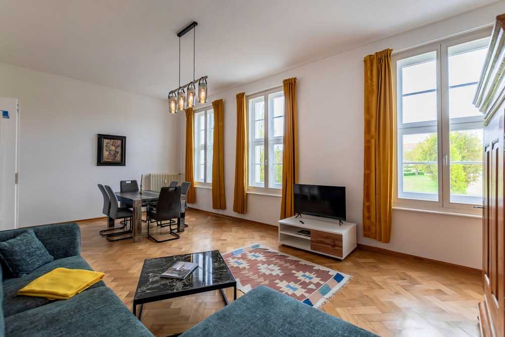 Diese großzügige Altbauwohnung aus dem Jahr 1850 befindet sich im 1. Obergeschoss eines denkmalgeschützten Mehrfamilienhauses mit insgesamt drei Etagen. Die neuwertige Etagenwohnung bietet auf 113 m² Wohnfläche vier Zimmer, darunter zwei Schlafzimmer, ein geräumiges Wohnzimmer und ein weiteres vielseitig nutzbares Zimmer. Das Badezimmer ist mit Badewanne, Dusche sowie einem Fenster ausgestattet.