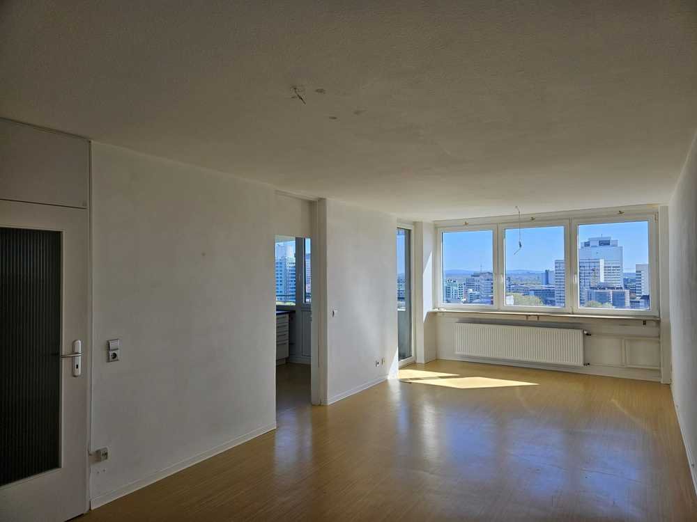 Die Wohnung inklusive Balkon ist nach Süden ausgerichtet mit Blick auf die Skyline von Frankfurt. Zur Wohnung gehört außerdem ein Kellerabteil.