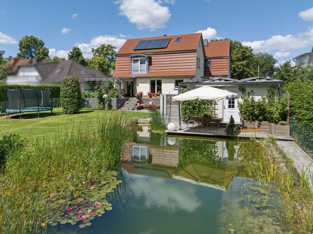 Der angrenzende Wintergarten lässt sich im Sommer vollständig öffnen und dient als erweiterter Wohnraum oder Terrasse. Der liebevoll angelegte Garten ist ein wahres Idyll – abwechslungsreich bepflanzt, gut abgeschirmt und mit zahlreichen Sonnen- und Schattenplätzen. Ein Schwimmteich lädt zur Erfrischung ein. Das angrenzende Nebengebäude beherbergt eine Sauna – Wellness pur im eigenen Zuhause.