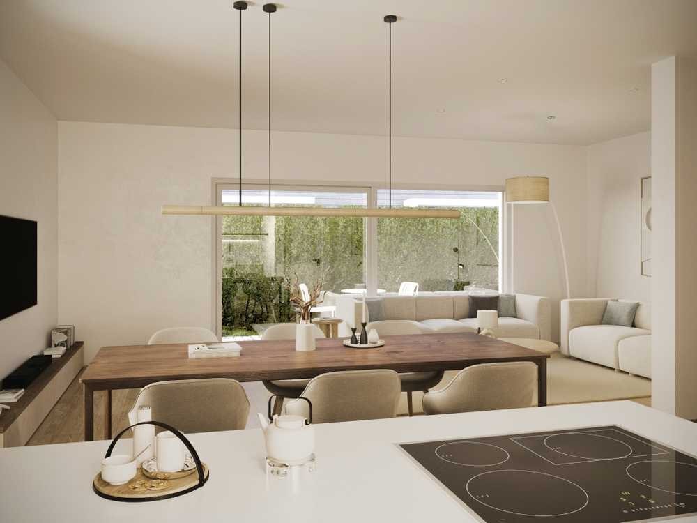 Das hier angebotene Reihenmittelhaus mit ca. 130 m² Wohnfläche, verteilt auf insgesamt 5,5 Zimmer, besticht durch eine gelungene und familienfreundliche Raumaufteilung. Alle Wohnräume sind mit bodentiefen Fenstern inklusive elektrischen Rollläden ausgestattet und bieten viel Entfaltungsspielraum für eine Familie. Im Erdgeschoss präsentiert sich das Wohnzimmer durch die große Schiebetür sehr hell und bietet Platz für eine gemütliche Wohnlandschaft. Prädestiniert für geselliges Kochen ist die offene Küche mit angrenzendem Essbereich. Zusätzlich sind ein Gäste-WC sowie eine praktische Garderobe vorhanden, die auch als Abstellraum genutzt werden kann. Auf der Terrasse und im Garten können Sie die Sonne genießen. Das Obergeschoss verfügt neben einem Tageslichtbad mit bodentiefer Dusche, Waschbecken und WC über drei schöne Zimmer, die optimal als Kinder- oder Arbeitszimmer genutzt werden können. Das Dachgeschoss bildet ein zusätzliches Highlight und eignet sich perfekt als persönlicher Rückzugsort der Eltern. Hier befindet sich nicht nur das Schlafzimmer mit großzügiger Ankleide, sondern ebenso das Arbeitszimmer, welches eine Rückzugsmöglichkeit und viel Ruhe bietet. Das Elternbad steht den übrigen Räumen in nichts nach und ist mit einer Badewanne ausgestattet. Das Untergeschoss ist komplett unterkellert. Zwei Abstellräume, wovon einer als vollwertiges Zimmer ausgebaut wird, sowie der Technik- und Waschraum sind dort vorhanden. Abgerundet wird das Angebot durch einen Stellplatz (zzgl. 10.000 EUR). Die Grundrisse können noch komplett nach Ihren Vorstellungen umgestaltet und individuell angepasst werden.