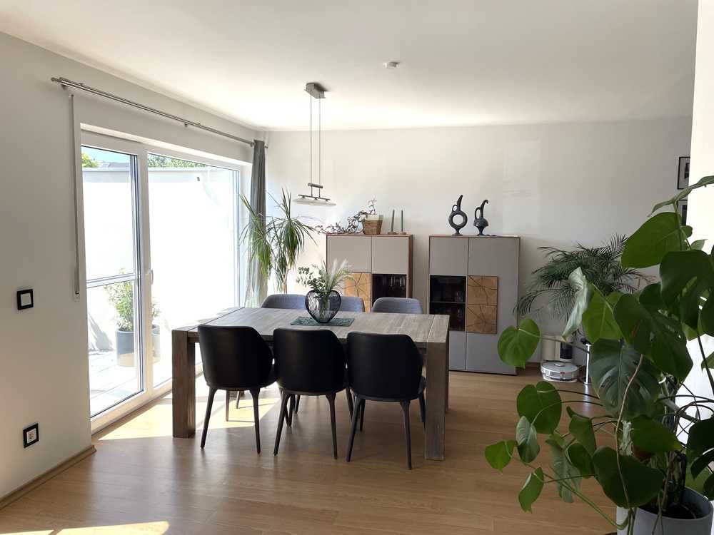 Die Terrasse im Erdgeschoss verfügt über eine elektrische Markise, deren integrierter Volant einen Hauch von Luxus bietet, der dazu einlädt, die Seele baumeln zu lassen. Als Highlight dieses herrlichen Wohnhauses dient die großflächige Dachterrasse im Obergeschoss mit einer Fläche von über 37 m². Mit ihr gewährt Ihnen dieses Haus das Privileg, die Sonnenuntergänge bei einem kühlen Glas Wein in intimer Atmosphäre und einer schönen Sicht über das Wohngebiet zu genießen.