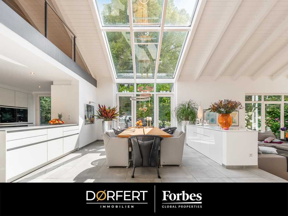 So gleitet der Blick von der offenen Küche über den Essbereich hin zum Wohnzimmer und wird getragen von der Offenheit bis unter das Dach. Dies ist der maßgebende Charakter dieser Villa. Diese Küche ist nicht nur ein Traum für passionierte Köche, sondern auch ein Ort der Zusammenkunft, an dem gesellige Treffen mit Familie und Freunden stattfinden. Hochwertige Elektrogeräte der Marke Miele und edle Küchenfronten aus Glas ergeben ein stimmiges Bild.