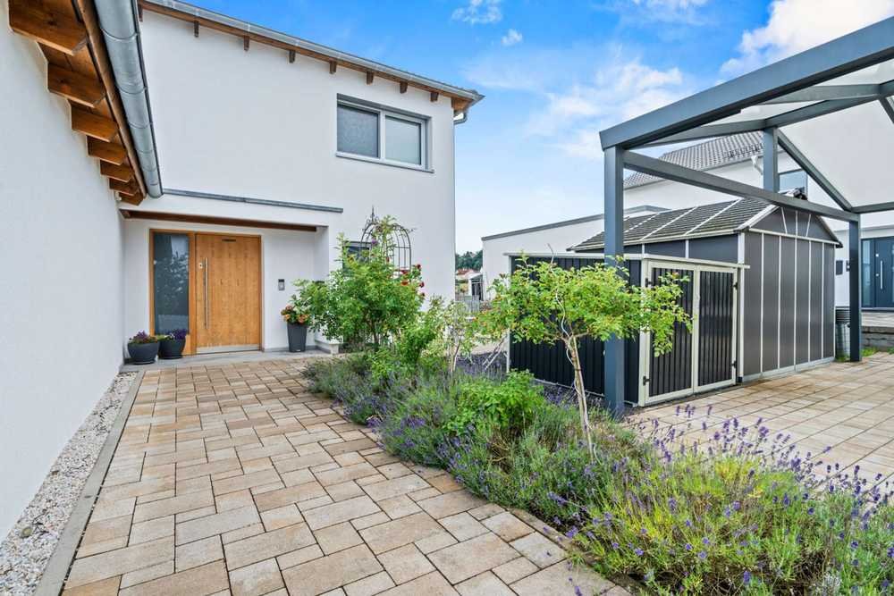 Das Grundstück selbst ist pflegeleicht angelegt und bietet neben einem kleinen Garten mit grünem Rückzugsort auch hervorragende Parkmöglichkeiten: Ein Carport mit zwei Stellplätzen, eine Doppelgarage sowie mindestens zwei weitere Außenstellplätze garantieren Platz für alle Fahrzeuge der Familie – und Gäste.