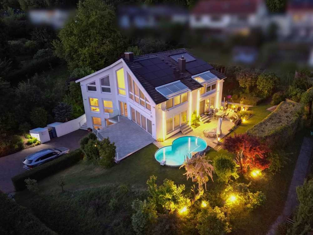 Der Außenbereich fügt sich harmonisch in das architektonische Gesamtkonzept ein. Zwei weitläufige Terrassen mit elektrischen Markisen gehen fließend in den gepflegten Garten über, in dem ein Pool zum Verweilen einlädt. Am Abend sorgt das besondere Beleuchtungskonzept für eine atmosphärische Kulisse.