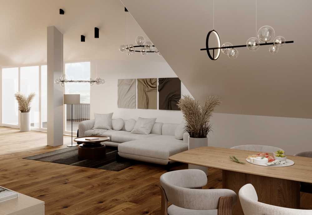 Der offen gestaltete Wohn-, Koch- und Essbereich bildet das Herzstück der Wohnung. Bodentiefe Fensterfronten schaffen eine helle, einladende Atmosphäre und führen direkt auf die großzügige Dachterrasse. Das ausgewogene Verhältnis von Wohn- zu Außenflächen – ergänzt durch einen weiteren Balkon – bietet viel Raum für Entspannung, Genuss und private Rückzugsmöglichkeiten.