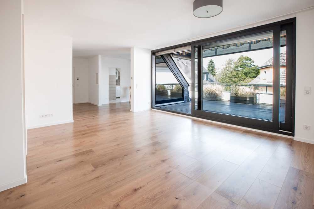 Der offene Wohnbereich bildet das Zentrum dieser Etage. Große Fensterflächen und der direkte Terrassenzugang verbinden Innen- und Außenbereich nahtlos miteinander. Die Holzoptik des Bodens sorgt für Wärme, die dunklen Fensterrahmen setzen stimmige Akzente. Ob als Lounge, Essbereich. Dieser Raum bietet viele Möglichkeiten, sich individuell einzurichten.